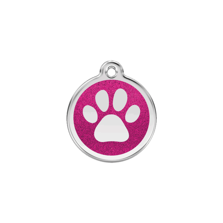 Der lebendige Pinkton mit Glitzereffekt hebt das Pfotenmotiv deutlich hervor und sorgt für eine gute Sichtbarkeit, besonders bei Katzen mit hellem Fell. Für eine persönliche Note lässt sich die Marke mit einer präzisen Gravur versehen, um Namen oder Kontaktdaten gut lesbar zu platzieren. Weitere Varianten in ähnlichem Stil finden Sie in der Kollektion Glitzer-Emaille und Edelstahl, die verschiedene Farben und Designs bietet.