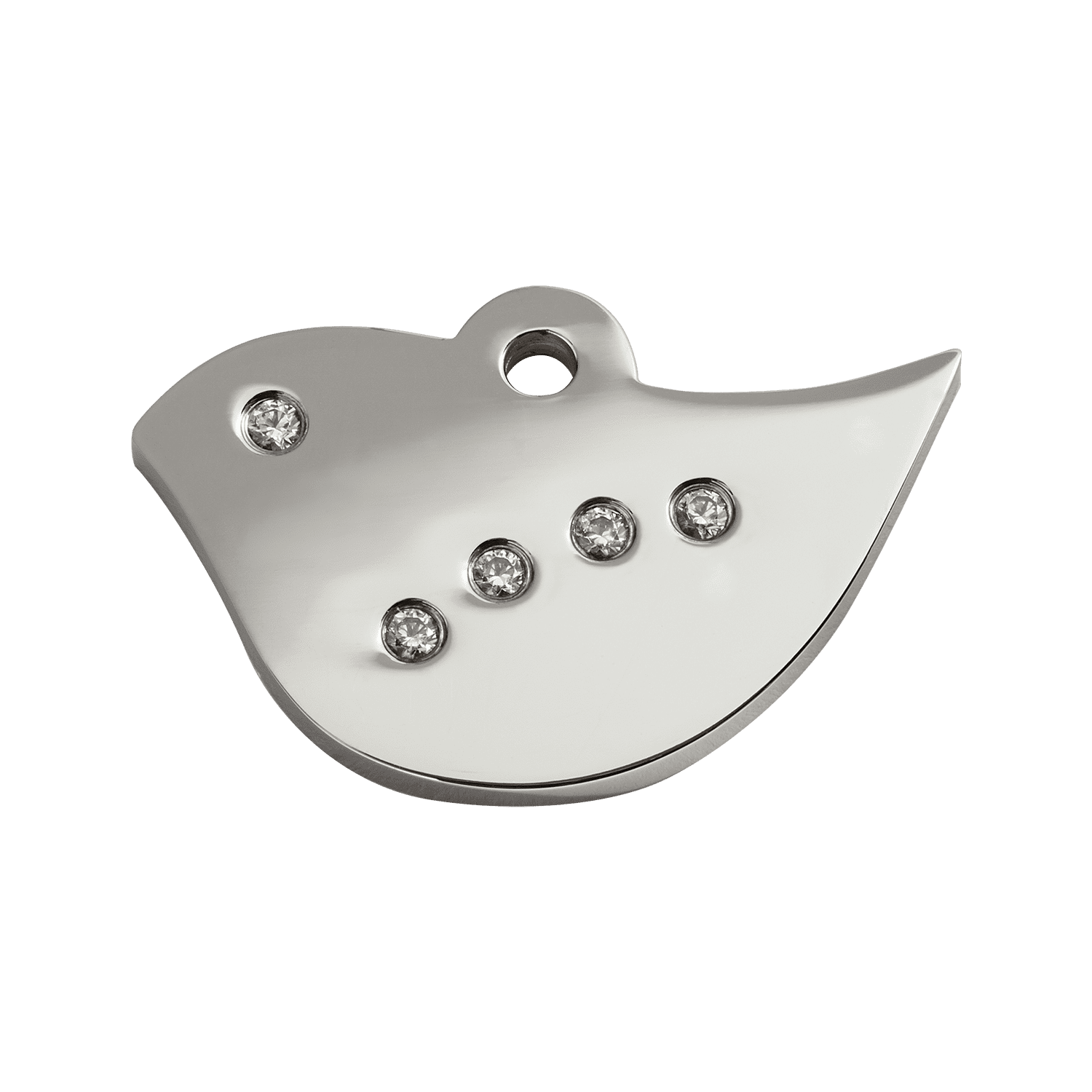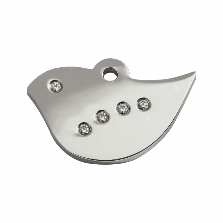 Das Vogelmotiv wird durch einen Swarovski Kristall veredelt, der Licht auf eine zurückhaltende Weise einfängt und so für einen feinen Glanz sorgt. Wer eine Hundemarke sucht, die sowohl sichtbar als auch unaufdringlich ist, trifft mit diesem Design eine passende Wahl.